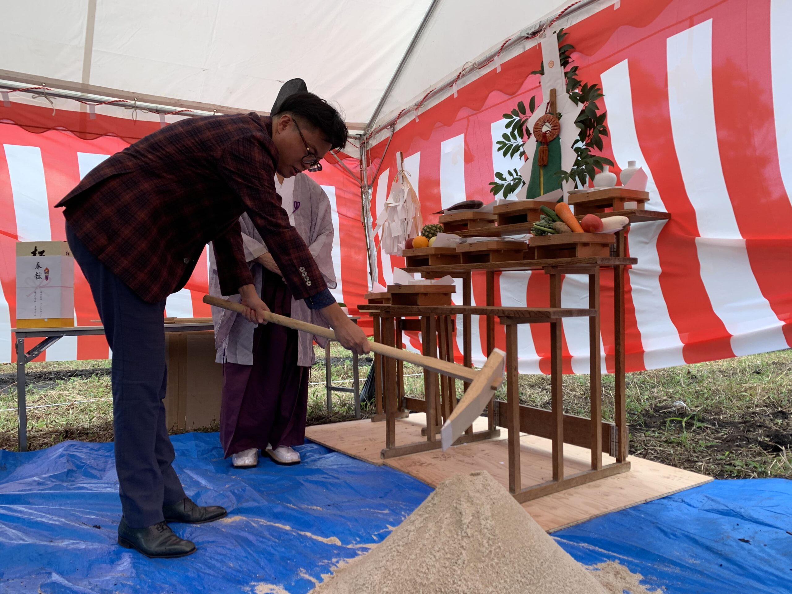 大山大神山神社の宮司さんに祈祷していただき建設工事が無事に終わることを皆で氏神様にお祈りしました。