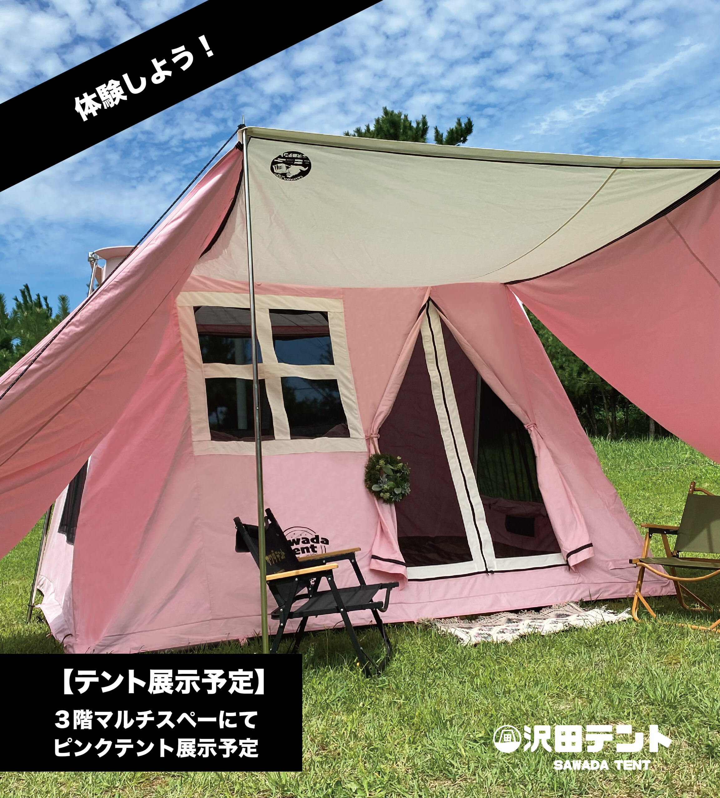 3Fマルチスペースでは沢田テントを体験していただけるスペースとして 限定ピンク(4~6人用)を展示いたします。
